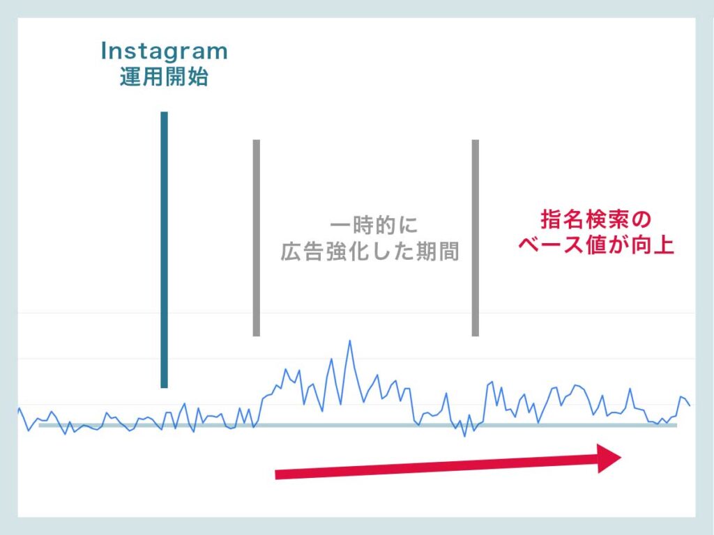 1か月強、広告配信を強化した期間があったことは事実(上図のグレー期間)です。しかしながら、その後は広告配信を行っていない期間であっても、Instagram配信前後ではベース値(指名検索での流入)は、確実に底上げされていることがサーチコンソールでは確認ができています。