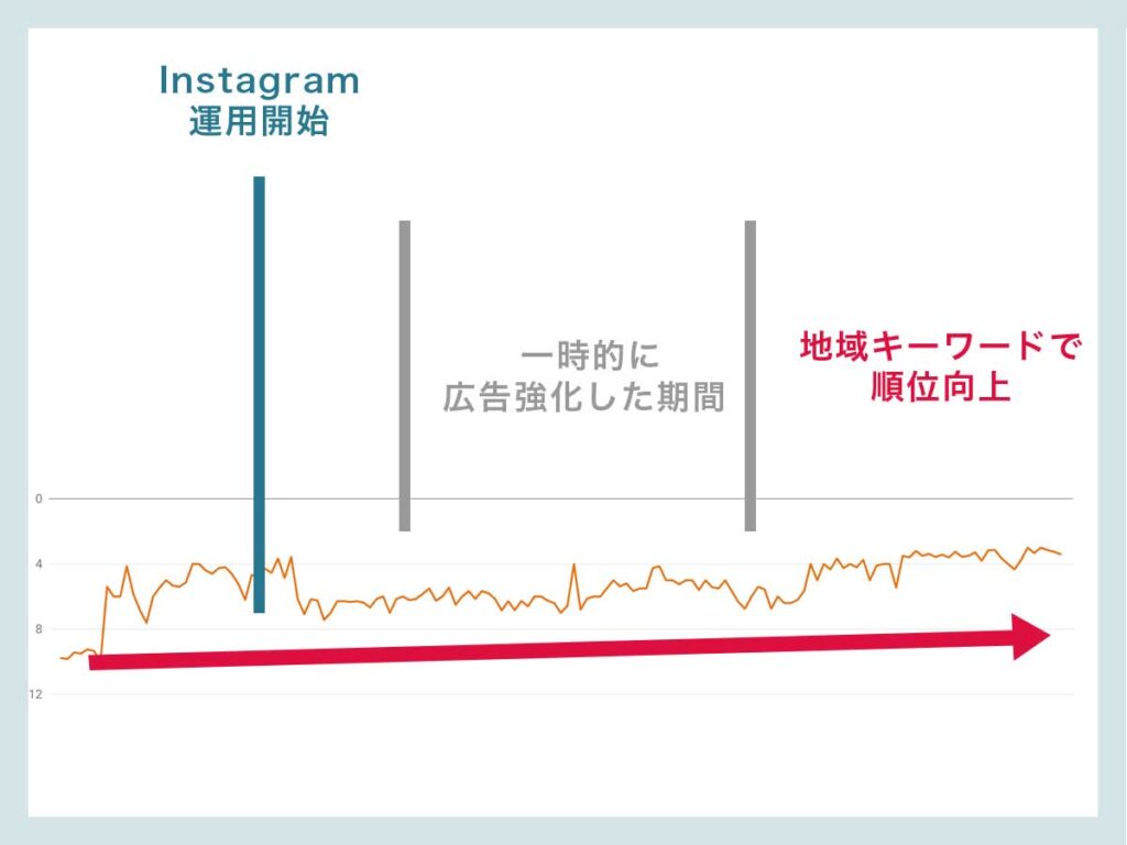 SEOはSEOで個別の施策を行っており、そこに指名検索やユーザー行動が加味されてエリアキーワードでの順位が向上した事例です。