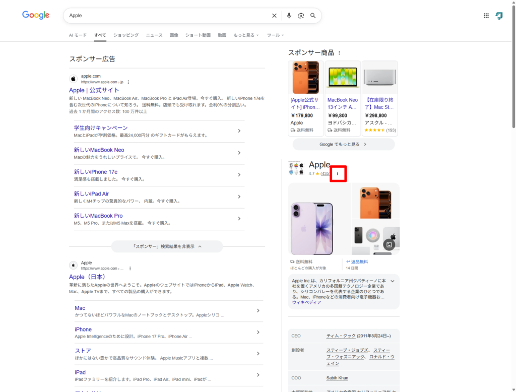 1つ目は、Googleで自社名を検索して、検索結果の右側にナレッジパネル(企業情報のボックス)が表示されるかどうか。表示されていれば、Googleは自社をエンティティとして認識しています。