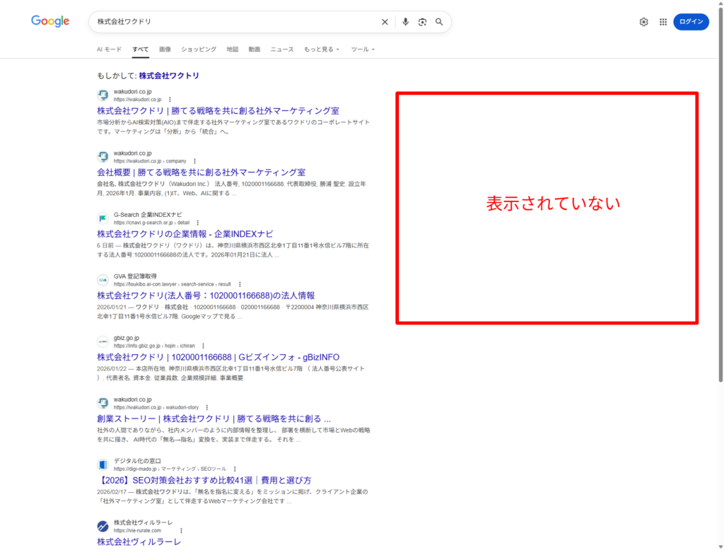 ナレッジパネルが表示されない場合、Googleはまだ自社を「固有の実体」として認識できていません。これは、施策2以降の効果が大幅に減殺されることを意味します。